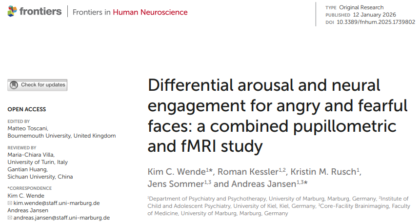 Wende KC; Kessler R; Rusch KM; Sommer J; Jansen A, 2025. Differential arousal and neural engagement for angry and fearful faces: a combined pupillometric and fMRI study.  Front Hum Neurosci 19:1739802